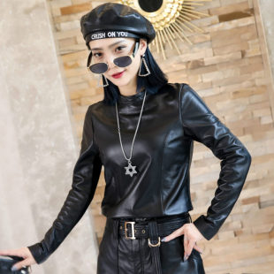 绵羊皮拼接蕾丝衫 新款 真皮修身 上衣立领长袖 打底衫 小衫 女2025秋季