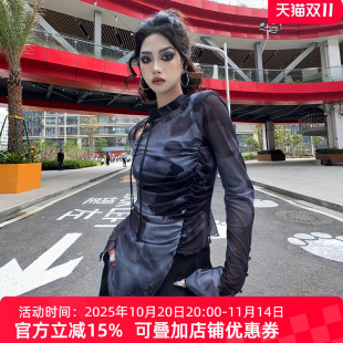 春夏 女显瘦t恤辣妹性感女装 新中式 国风网纱透视上衣薄透明打底衫