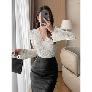 显瘦镂空打底衫 黑色蕾丝修身 性感女人味V领喇叭袖 新款 上衣女秋季