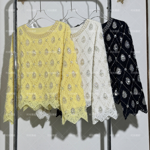 上衣潮流 女气质锯齿边菱形圆领长袖 时尚 雅妮欧美风重工钉珠亮片衫