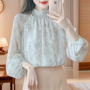 新款 气质上衣别致减龄洋气小衫 时尚 雪纺衬衫 女 印花长袖 2025春夏季
