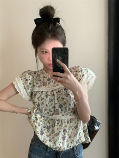 新款 女高级感夏季 复古泡泡袖 衬衣短款 上衣 法式 短袖 蕾丝小碎花衬衫