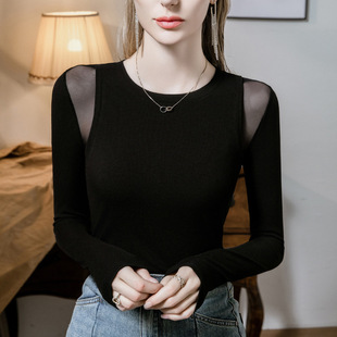 网纱t恤女士内搭性感微透蕾丝上衣 女秋木耳边长袖 高领薄款 打底衫