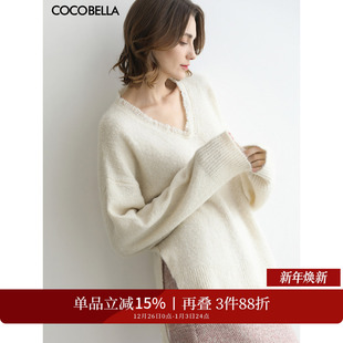 COCOBELLA设计感V领亮片白色针织衫 女秋冬毛边内搭毛衣MZ3278