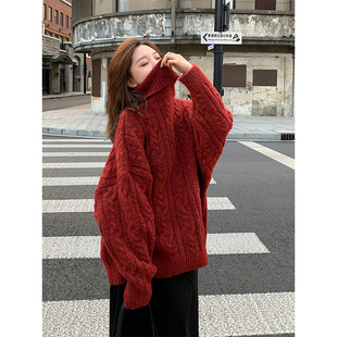 日系复古红色麻花高领毛衣女秋冬新款 宽松慵懒风加厚内搭针织上衣