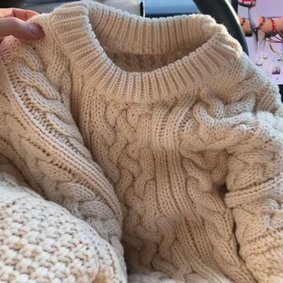 宽松慵懒风针织上衣 新款 加厚版 复古白色粗针麻花套头毛衣女冬季