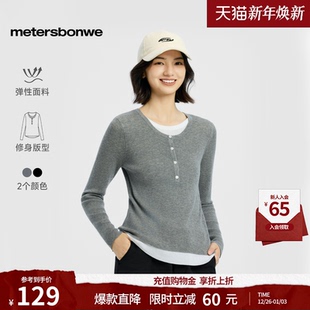 圆领针织羊毛衫 假两件灰色打底衫 新款 美特斯邦威毛衣女2025秋季