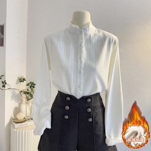白色假两件高领磨毛加厚衬衫 女秋冬宽松休闲内搭叠穿衬衣港风上衣