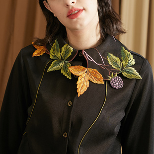 • 咖沫原创设计秋冬树叶莓果异形刺绣领翻领小众长袖 女衬衣 光泽衬衫