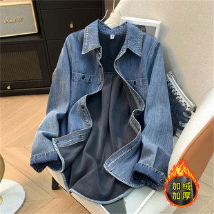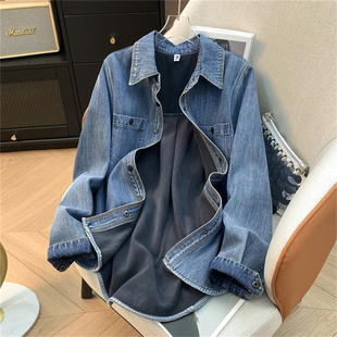 上衣复古休闲外套秋冬少女衬衣内搭叠穿 加绒加厚牛仔衬衫 女装 爆款