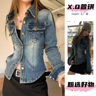 夹克上衣 外套女早秋显瘦设计感短款 港风复古正肩修身 收腰牛仔衬衫
