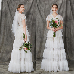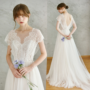 新款 蕾丝新娘婚纱设计师V领显瘦露背甜美超仙森系草坪婚纱旅拍纱