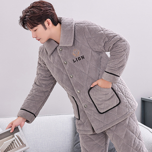 加厚加绒保暖法兰绒家居服套装 睡衣三层夹棉珊瑚绒冬款 男士 秋冬季