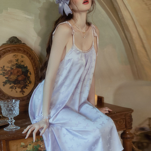 今夕何夕性感睡衣女冰丝缎面蝴蝶结印花高级感蕾丝吊带睡裙家居服