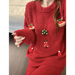 珊瑚绒家居服套装 大码 冬天半边绒圣诞喜庆新年红保暖睡衣女秋冬季