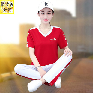 2025新款 女夏季 中年妈妈装 时尚 冰丝短袖 休闲服两件套夏装 运动套装