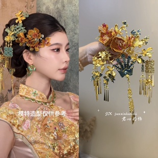 君心家 头饰 高级感点翠色橙色花朵囍字凤钗八件套新娘中式