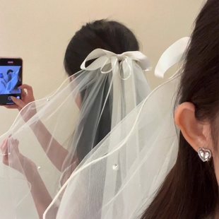 新娘主婚头纱领证登记拍照道具蝴蝶结头饰超仙森系公主蓬蓬纱短款