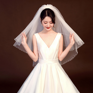 原创新款 拖尾新娘婚纱软纱头饰超仙 复古珍珠拍照道具发箍头纱长款