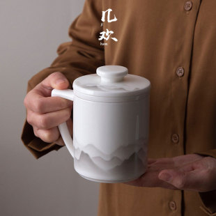 羊脂玉千里江山泡茶杯陶瓷茶水分离杯带盖过滤马克杯白瓷杯子