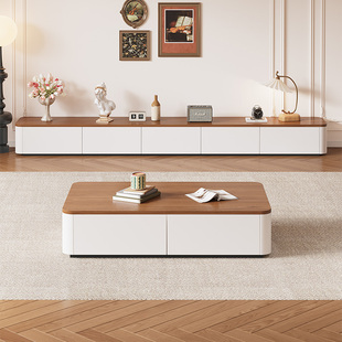 岩板电视柜茶几组合客厅家用2025新款 奶油风落地实木电视机柜柜子
