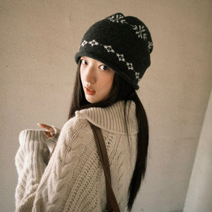 毛线帽女秋冬百搭字母标麻花菱形纹加绒针织帽街头出游保暖套头帽