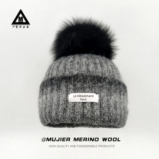 冰岛多巴胺渐变色针织帽子女秋冬保暖护耳羊毛狐狸毛球毛线帽冷帽