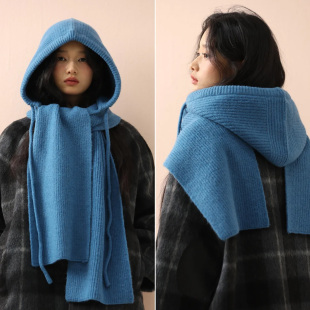 蓝色巴拉克拉法帽女款 大头围护耳保暖毛线帽针织帽子围巾一体 冬季