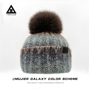 冰岛星空渐变色段染针织帽子女秋冬羊毛保暖护耳狐狸毛球毛线帽