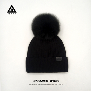 冰岛100%纯羊毛针织帽子女秋冬保暖花少热巴同款 狐狸毛球毛线帽潮