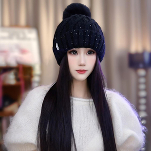 毛球针织毛线帽女秋冬保暖2025新款 洋气加厚防寒帽子女包头帽 时尚