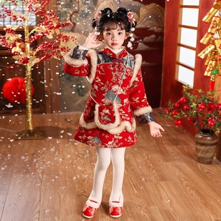 拜年服冬装 女孩旗袍加绒唐装 马甲女童汉服红色新年新中式 儿童冬季