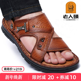 男真皮外穿防滑中年爸爸沙滩鞋 老人头男士 休闲凉拖鞋 2025夏季 凉鞋
