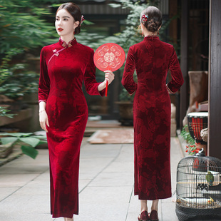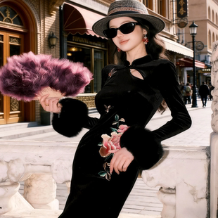 高端大气上档次日常可穿长袖 2025新款 连衣裙 植绒旗袍长款 高档中式