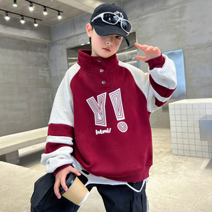 男童立领加绒红色卫衣2026新款 儿童上衣潮 中大童秋冬一体绒打底衫