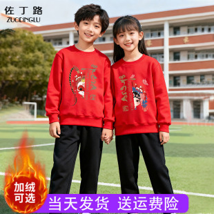 儿童白色卫衣男童薄绒一体绒女童红色上衣幼儿园小学生运动会服装
