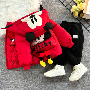 男童冬装 羽绒棉服潮 加绒加厚外套女童卡通米奇棉服女宝宝棉衣套装