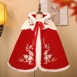 女童冬季 外套中国风女宝外出超仙汉服披风冬 喜庆保暖加厚斗篷长款