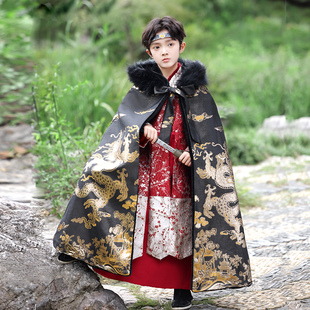 高端男童披风秋冬季 中国风汉服披肩加厚保暖黑色连帽斗篷外搭 长款