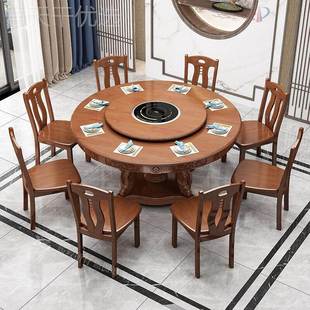 实木PLW餐桌家椅组合现代新中式 .8米大圆桌带转桌盘1用雕花火锅子