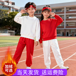 • 旦儿童啦啦队演出服 加绒小学生运动会班服元 红色卫衣白色裤 子套装