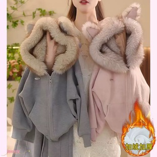 男女童卡通耳朵加绒卫衣外套秋冬2025新款 加厚一体绒毛领上衣保暖