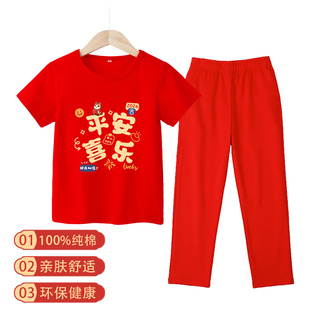 套装 2026马年本命年衣服12岁男童女童红色居家服纯棉儿童半袖 长裤