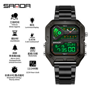 ins爆款 学生运动电子手表合金壳防水夜光三地时间多功能百搭腕表