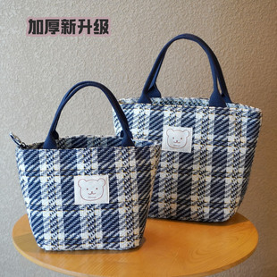 时尚 格纹大容量帆布包手提饭盒包加厚简约百搭休闲拉链便当包学生