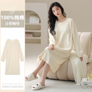• 2025新款 睡裙女秋季 女士雅淡睡衣秋女款 全棉秋冬季 纯棉带胸垫长袖