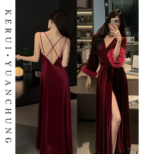 加绒睡袍吊带女性感纯欲高级新款 秋冬法式 成熟贵妇 胭脂Rose