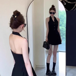 黑色挂脖V领西装 露背高端气质上衣外穿小坎肩 马甲设计感辣妹短款