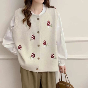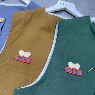 • 2025秋季 坎肩马甲女韩系文艺纯色宽松小香风马甲 圆领绣花小熊无袖