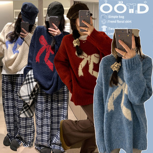 宽松圆领蝴蝶结绣花毛衣慵懒软糯打底上衣秋冬 时尚 孕妇装 2025新款